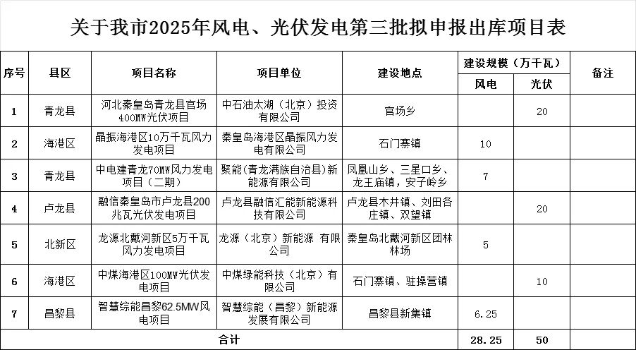 12月3日,河北秦皇岛市发展和改革委员会发布《关于我市申请2025年风电、光伏发电第三批项目出库建设的公示》。根据公示,第三批申请出库项目共7个,规模合计78.25万千瓦,其中,风电项目4个,规模合计28.25万千瓦,光伏项目3个,规模合计...