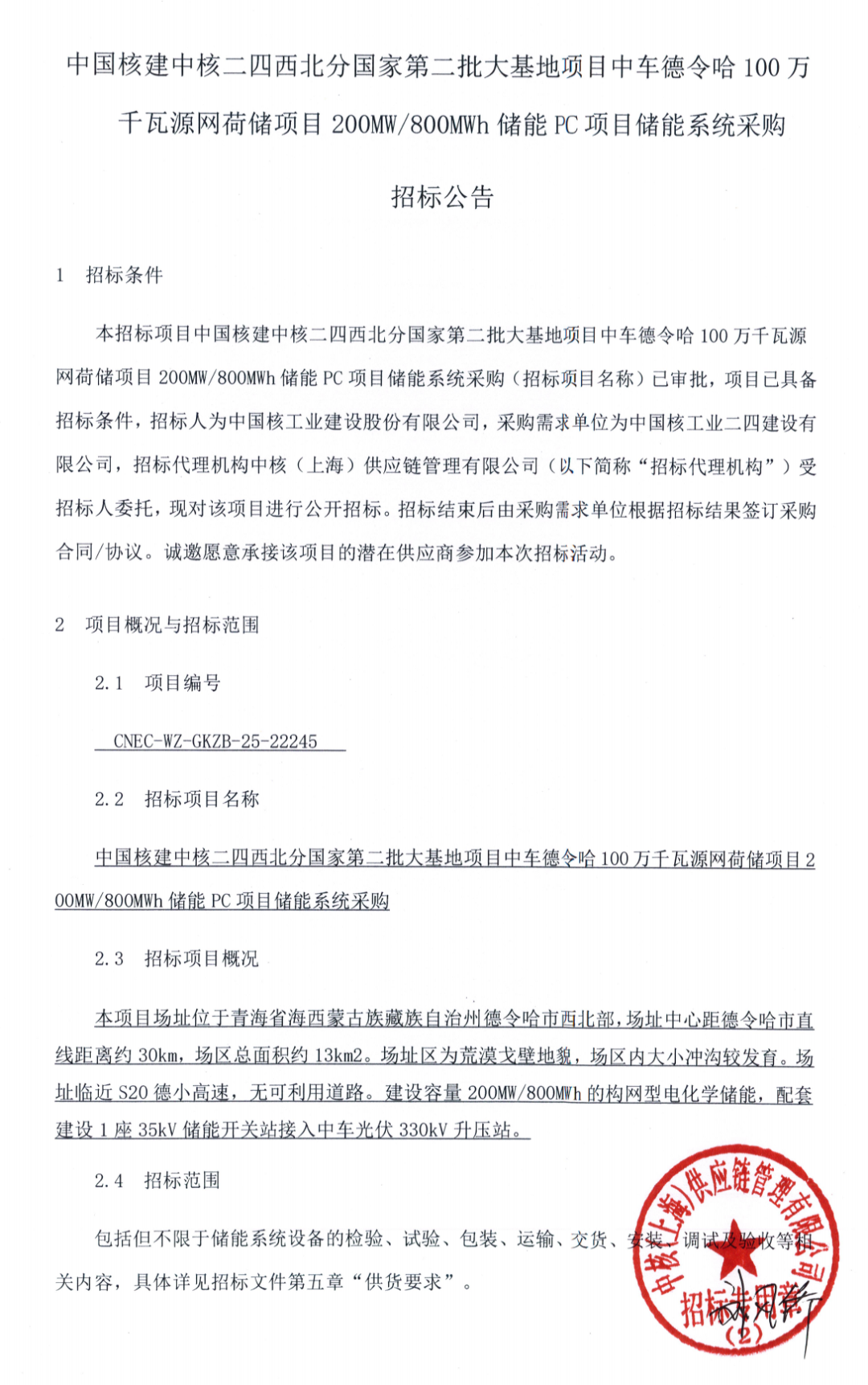 北极星储能网讯:2025年12月3日,中核集团发布中国核建中核二四西北分国家第二批大基地项目中车德令哈100万千瓦源网荷储项目200MW/800MWh储能PC项目储能系统采购招标公告。招标人为中国核工业建设股份有限公司,采购需求单位为中国核...