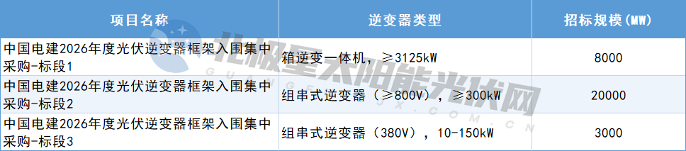 从中国电建阳光采购网官网获悉,12月3日,中国电建2026年度光伏逆变器框架入围集中采购发布,招标公告显示,采购箱逆变一体机、组串式逆变器,总规模达到31GW,分三个包件,详情如下:注:本年度集中采购成果的适用范围包括国内和海外项目。开标时...