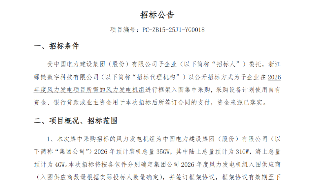 北极星风力发电网获悉,12月3日,中国电建阳光采购网发布《中国电建2026年度风力发电机组框架入围集中采购项目公开招标公告》。公告显示,本次集中采购招标的风力发电机组为中国电力建设集团(股份)有限公司(以下简称“集团公司”)2026年预计装...