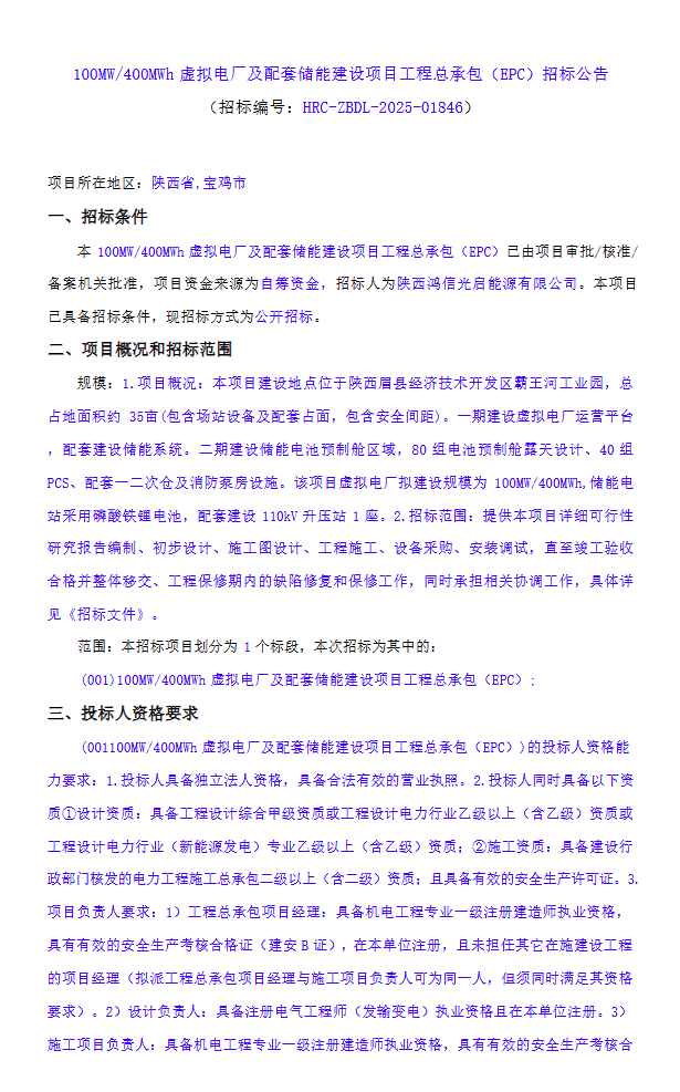 12月3日,陕西鸿信光启能源有限公司发布100MW/400MWh虚拟电厂及配套储能建设项目工程总承包(EPC)招标公告。本项目建设地点位于陕西宝鸡眉县经济技术开发区霸王河工业园,总占地面积约35亩(包含场站设备及配套占面,包含安全间距)。一...