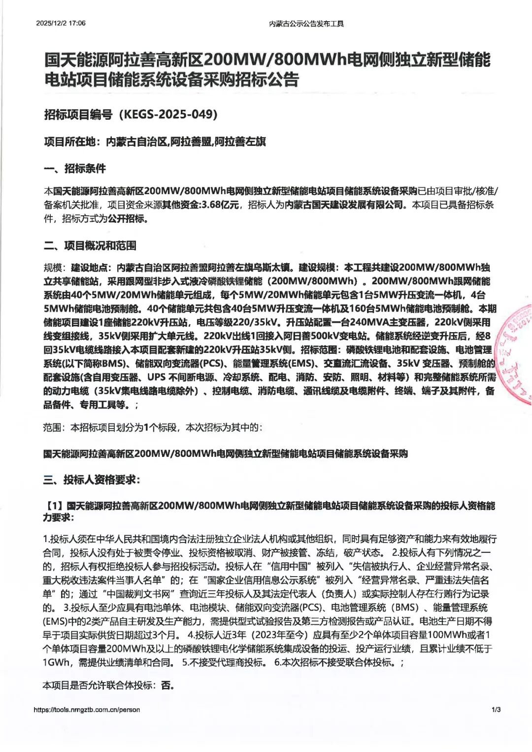 北极星储能网讯:2025年12月3日,内蒙古国天建设发展有限公司发布招标公告,建设200MW/800MWh独立共享储能站,采用跟网型非步入式液冷磷酸铁锂储能。项目资金来源其他资金,共3.68亿元,项目所在地为内蒙古自治区阿拉善盟阿拉善左旗。...