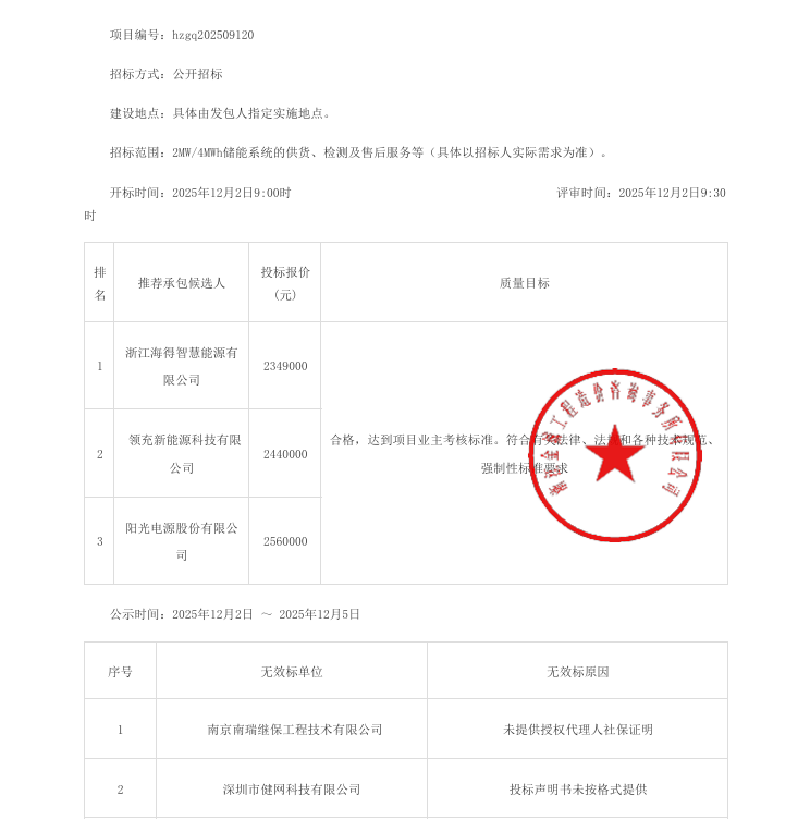 北极星储能网获悉,12月2日,新开集团2MW/4MWh储能项目(第一批)储能系统采购项目中标候选人公示。据公示,第一中标候选人为浙江海得智慧能源有限公司,投标报价为2349000元,折合单价0.5873元/Wh;第二中标候选人为领充新能源科...