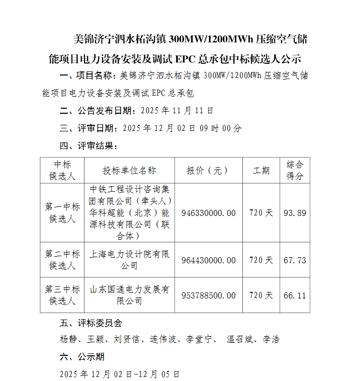 北极星储能网获悉,12月2日,美锦济宁泗水柘沟镇300MW/1200MWh压缩空气储能项目电力设备安装及调试EPC总承包中标候选人公示。根据公示,该储能项目中标候选人:第一中标候选人为中铁工程设计咨询集团有限公司(牵头人),华科超能(北京)...