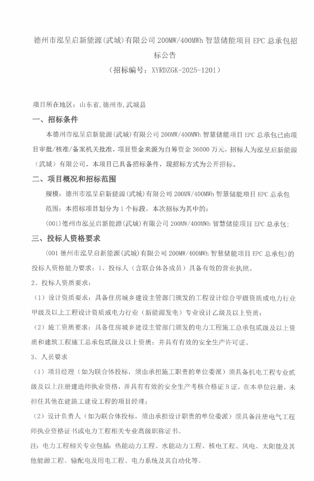 12月1日,德州市泓呈启新能源(武城)有限公司200MW/400MWh智慧储能项目EPC总承包招标公告发布。项目招标人为泓呈启新能源(武城)有限公司,项目位于山东省德州市武城县武城镇付王庄南,项目总容量200MW/400MWh,其中磷酸铁锂...