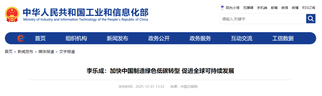 2025年12月1日,《中国日报》刊发工业和信息化部党组书记、部长李乐成署名文章,题为《加快中国制造绿色低碳转型促进全球可持续发展》。文章指出,加强绿色产业国际合作。中国制造将秉持共商共建原则,利用好双边和多边国际合作机制,深化绿色技术、绿...