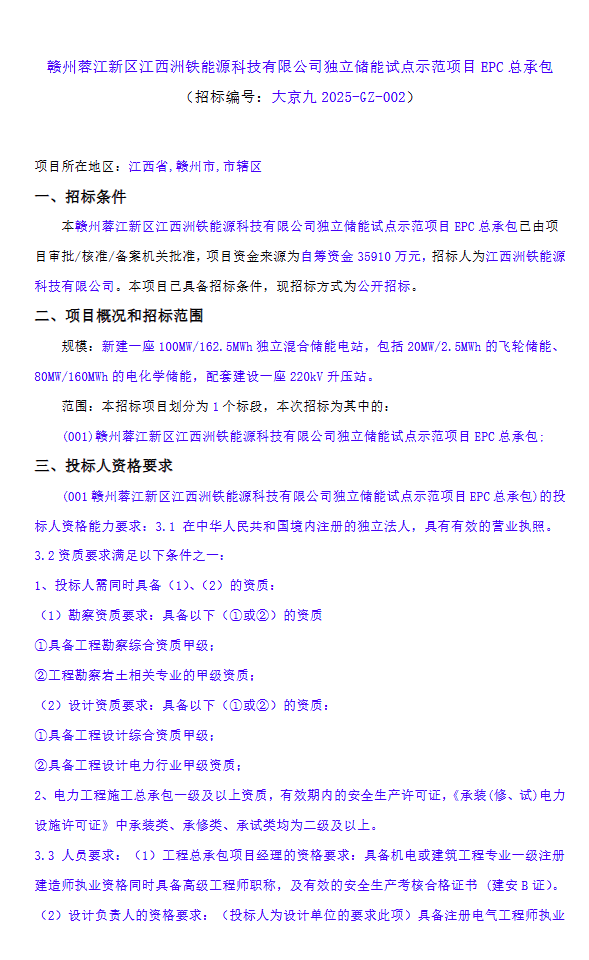 11月30日,赣州蓉江新区江西洲铁能源科技有限公司独立储能试点示范项目EPC总承包招标公告发布。项目招标人为江西洲铁能源科技有限公司,项目位于江西省赣州市。项目新建一座100MW/162.5MWh的独立混合储能电站,包括20MW/2.5MW...