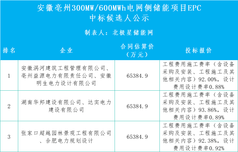 11月28日,涡阳县电网侧储能项目EPC(评定分离)中标候选人公示。第一中标候选人为安徽涡河建筑工程管理有限公司、亳州益源电力有限责任公司、安徽明生电力设计有限公司联合体投标报价:工程费用施工费率(含设备采购及安装、工程施工及其他相关内容)...