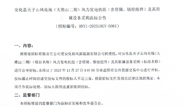 北极星风力发电网获悉,11月28日,湖南省招标投标监管平台发布《安化县天子山风电场(大熊山二期)风力发电机组(含塔筒、锚栓组件)及其附属设备采购》流标公告。公告显示:因投标截止时间前递交投标文件的投标人不足三家,根据招标文件及相关法律法规的...