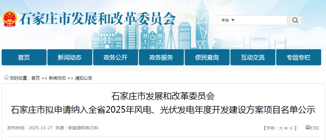 北极星风力发电网获悉,11月27日,河北石家庄市发展和改革委员会发布《石家庄市拟申请纳入全省2025年风电、光伏发电年度开发建设方案项目名单公示》。公示显示,石家庄市储备类项目拟申请纳入全省2025年风电、光伏发电年度开发建设方案项目名单共...