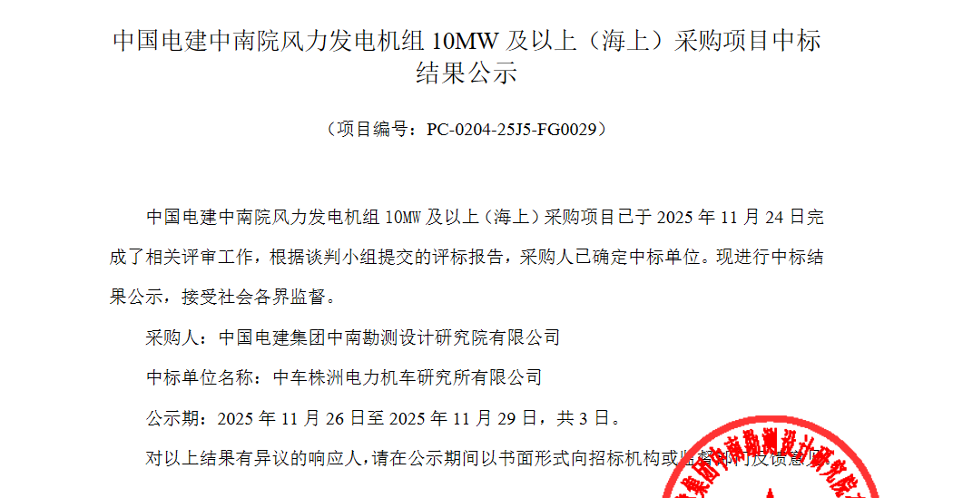 11月26日,中国电建阳光采购网发布《中国电建中南院风力发电机组10MW及以上(海上)采购项目中标结果公示》。根据公示,中车株洲所成功中标该项目。据此前报道,今年以来,中车株洲所还斩获两份海上风机订单,分别是辽宁华电丹东东港一期100万千瓦...