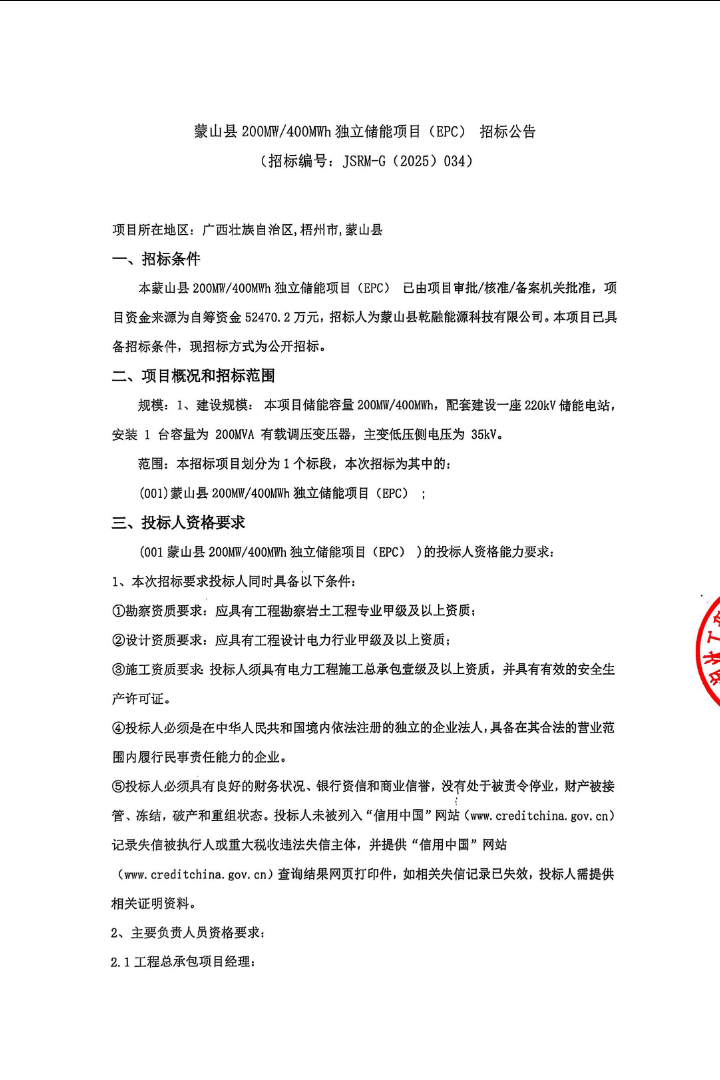 11月27日,蒙山县200MW/400MWh独立储能项目(EPC)招标公告发布,该项目所在地位于广西壮族自治区梧州市蒙山县,已资金来源为自筹资金52470.2万元,招标人为蒙山县乾能能源科技有限公司,目前项目已具备招标条件,招标方式为公开招...