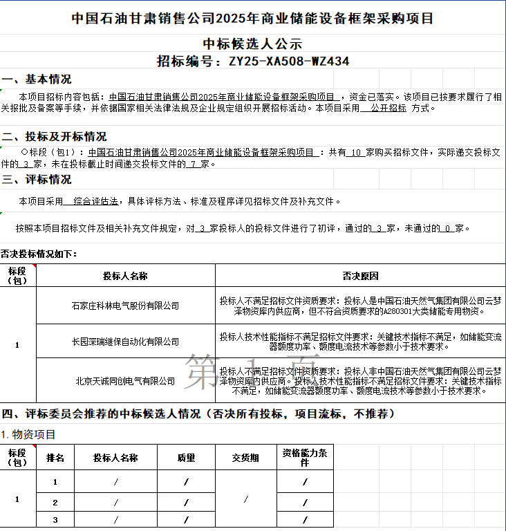 北极星储能网获悉,9月19日,中国石油甘肃销售公司2025年商业储能设备框架采购项目中标候选人公示,公示显示,评标委员会否决所有投标,项目流标,不推荐中标候选人。本项目计划为加油(气)站采购分布式储能系统,系统主要由高效PCS、电池系统、E...