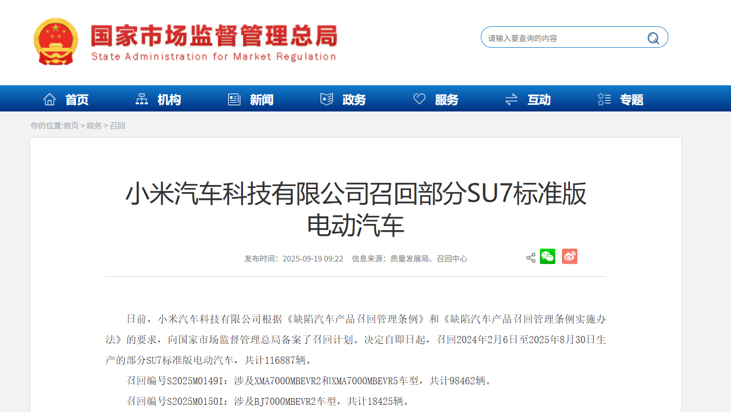 北极星储能网获悉,9月19日,国家市场监督管理总局发布小米汽车科技有限公司召回部分SU7标准版电动汽车,共计116887辆。详情如下:日前,小米汽车科技有限公司根据《缺陷汽车产品召回管理条例》和《缺陷汽车产品召回管理条例实施办法》的要求,向...