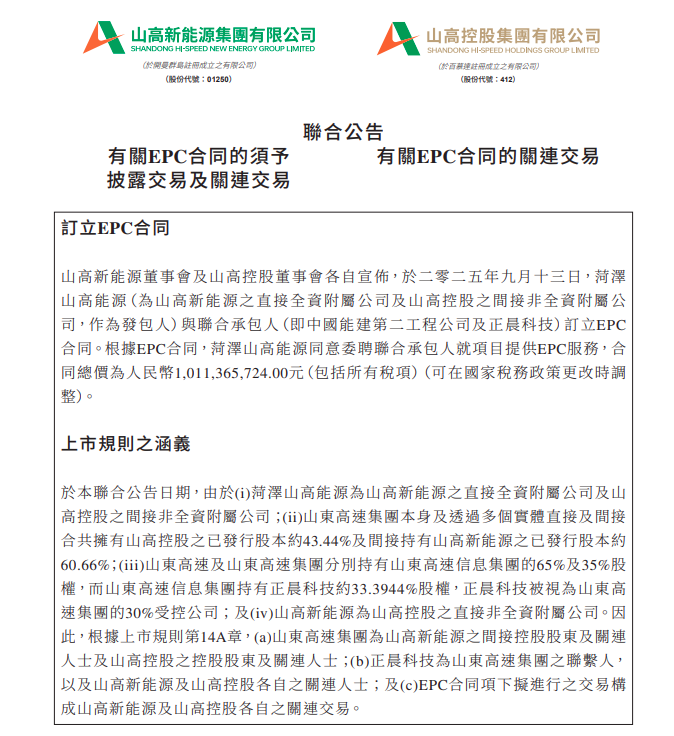 9月14日,山高新能源发布公告,山高新能源的全资附属公司菏泽山高能源(发包人)于2025年9月13日与中国能建第二工程公司及正晨科技(联合承包人)签署了EPC合同,合同总价为10.11亿元(包括所有税项)。该合同涉及位于山东省菏泽市的175...