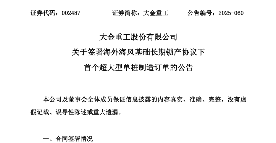 北极星风力发电网获悉,9月11日,大金重工股份有限公司(以下简称“大金重工”或“公司”)发布《关于签署海外海风基础长期锁产协议下首个超大型单桩制造订单的公告》。公告披露,2024年4月,大金重工全资子公司蓬莱大金海洋重工有限公司(以下简称“...