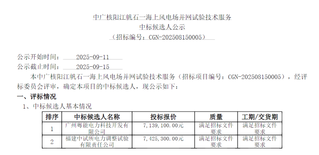 中广核阳江帆石一海上风电场并网试验技术服务中标候选人公示项目规模:项目规划装机容量为1000MW。招标内容与范围:根据所管辖电网海上风电场站并网要求完成阳江帆石一项目电网验收相关试验项目,包括现场试验、全场仿真建模试验和单机仿真建模试验。...
