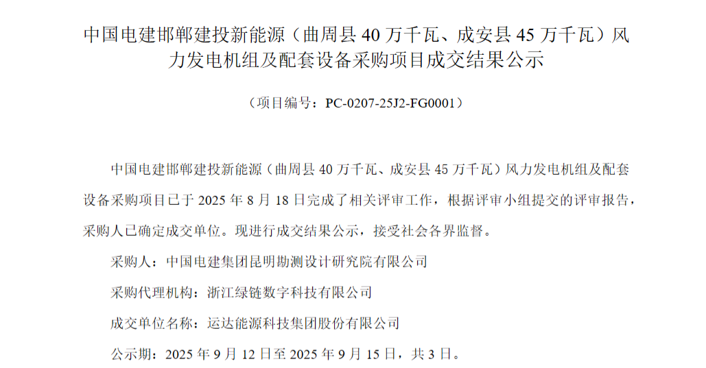北极星风力发电网获悉,9月12日,中国电建阳光采购网发布《中国电建邯郸建投新能源(曲周县40万千瓦、成安县45万千瓦)风力发电机组及配套设备采购项目成交结果公示》。根据公示,运达股份成功中标该项目。邯郸建投新能源曲周县40万千瓦风电项目位于...