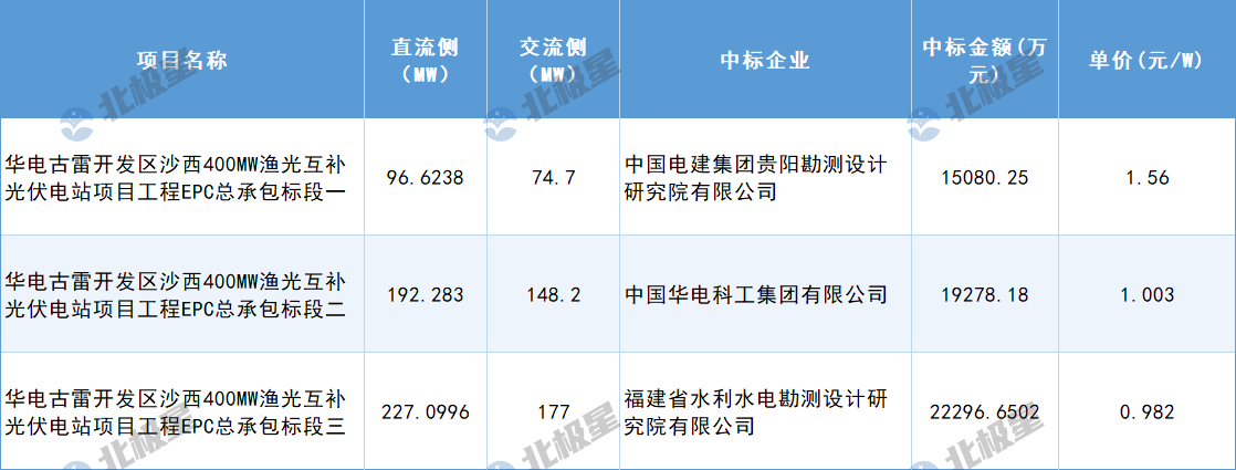 1月7日,华电古雷开发区沙西400MW渔光互补光伏电站项目工程EPC总承包招标项目中标结果公示,本项目分为3个标段,中标企业分别为中国电建集团贵阳勘测设计研究院有限公司、中国华电科工集团有限公司、福建省水利水电勘测设计研究院有限公司。单价区...