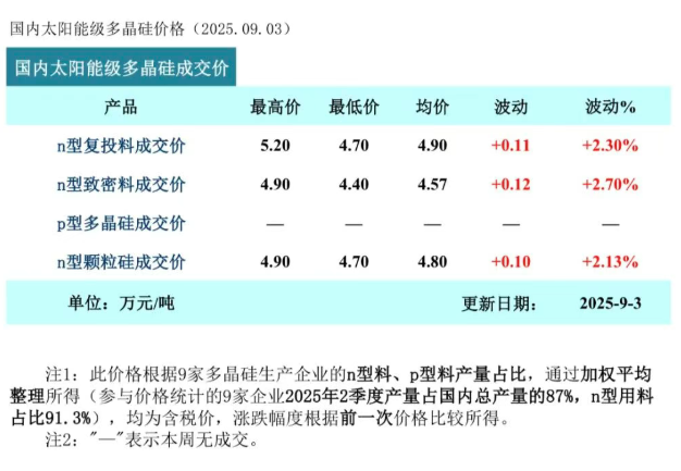 9月3日,硅业分会公布最新多晶硅价格,本周多晶硅价格全线上涨,最高涨幅为n型致密料,均价4.57万元/吨,涨幅2.7%。但硅业分会一反常态,并未就硅料价格做出进一步分析,详情见下:...