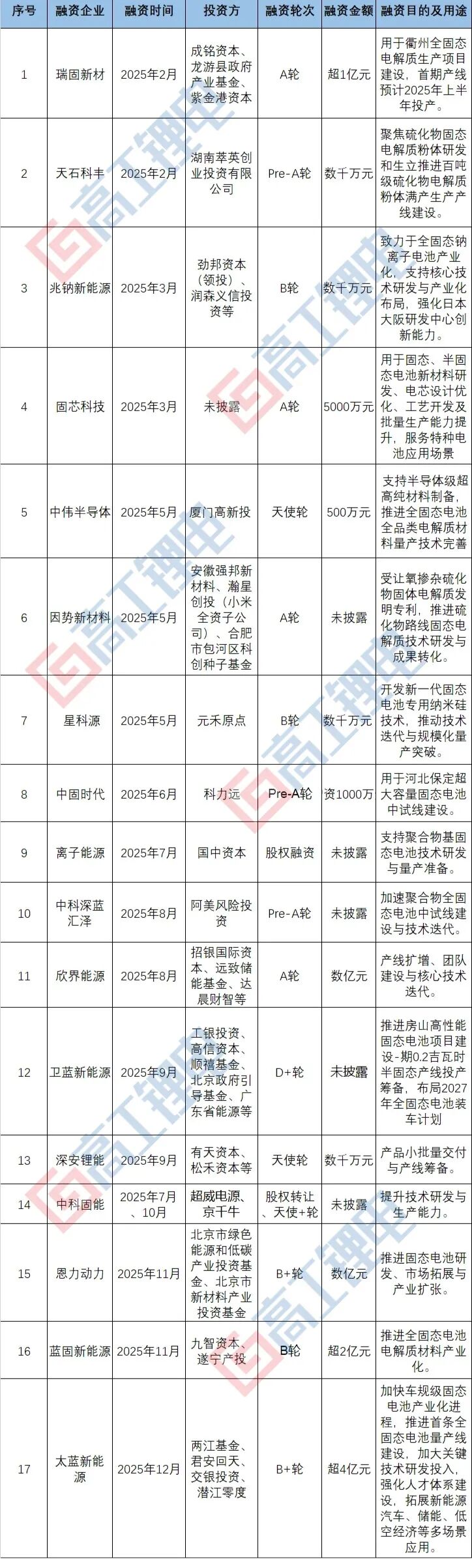 2025年,国内固态电池领域迎来融资爆发期,技术突破与政策支持形成共振,推动行业从"实验室阶段"加速迈向"产业化蓝海"。资本的密集入局不仅为技术攻关注入动力,更折射出产业链对下一代动力电池路线的共识,行业发展正进入关键转折期。高工锂电梳理了...