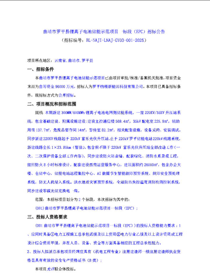 1月12日,曲靖市罗平县锂离子电池储能示范项目一标段(EPC)发布招标公告,该项目位于云南省曲靖市罗平县,项目资金为自筹资金96000万元(约合1.6元/Wh),招标人为罗平绿能科技有限公司。据公告内容,该项目为规模300MW/600MWh...
