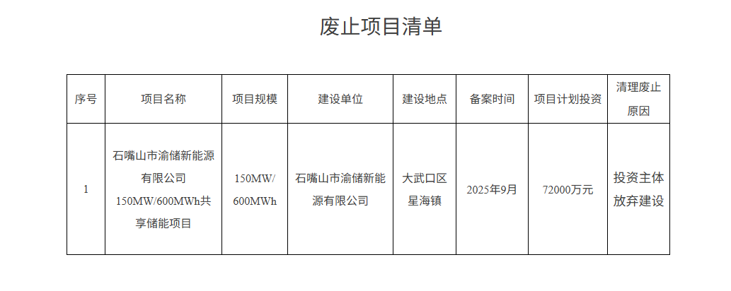 北极星储能网获悉,1月4日,宁夏石景山大武口区发展和改革局发布废止石嘴山市渝储新能源有限公司150MW/600MWh共享储能项目的公告,项目计划投资72000万元,清理废止原因为投资主体放弃建设。原文如下:大武口区发展和改革局关于废止石嘴山...