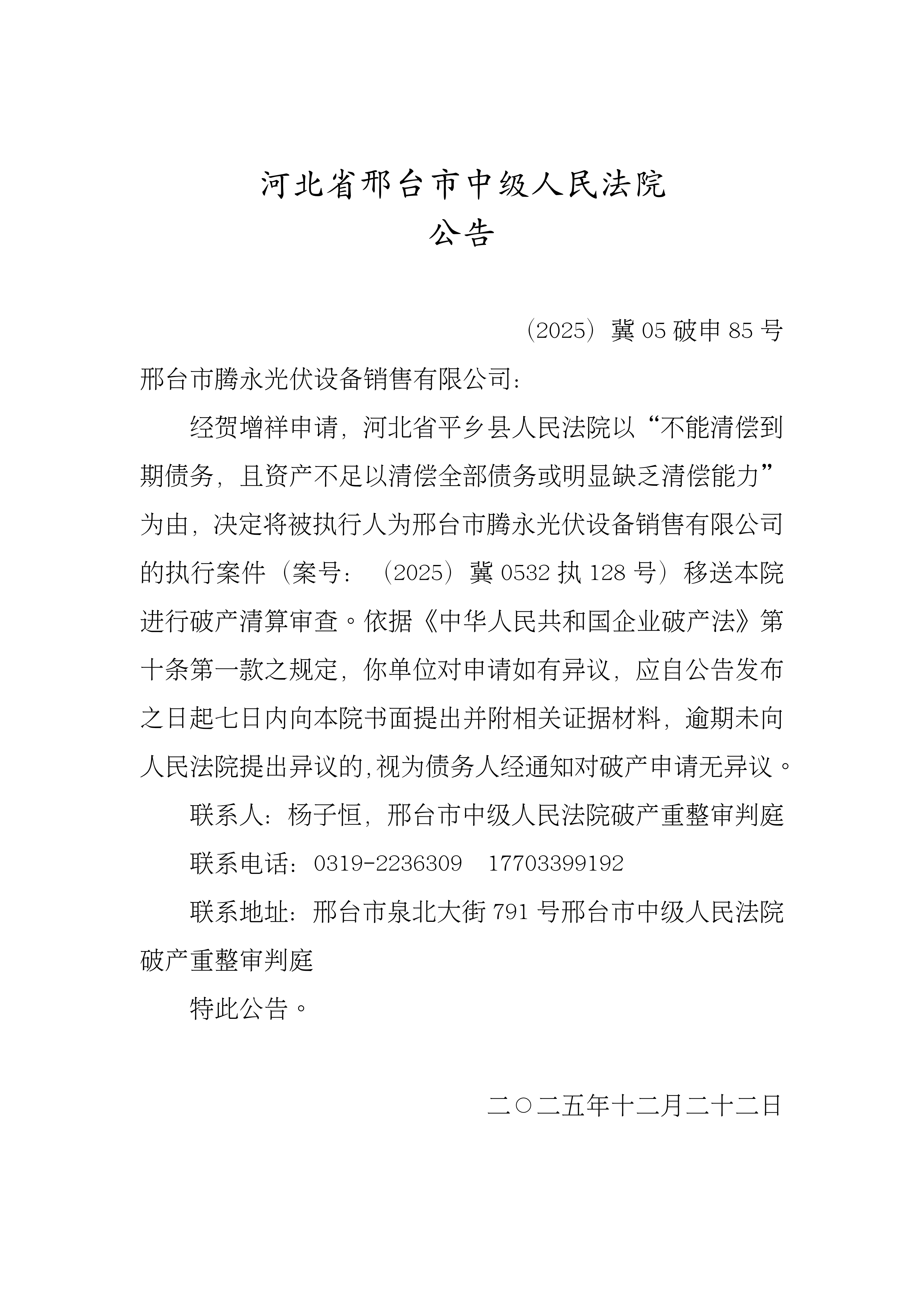 据全国企业破产重整案件信息网公示,邢台市腾永光伏设备销售有限公司因“无法偿还到期债务,且现有资产不足以清偿全部债务,或明显缺乏债务清偿能力”,已被相关方申请进入破产清算程序。...