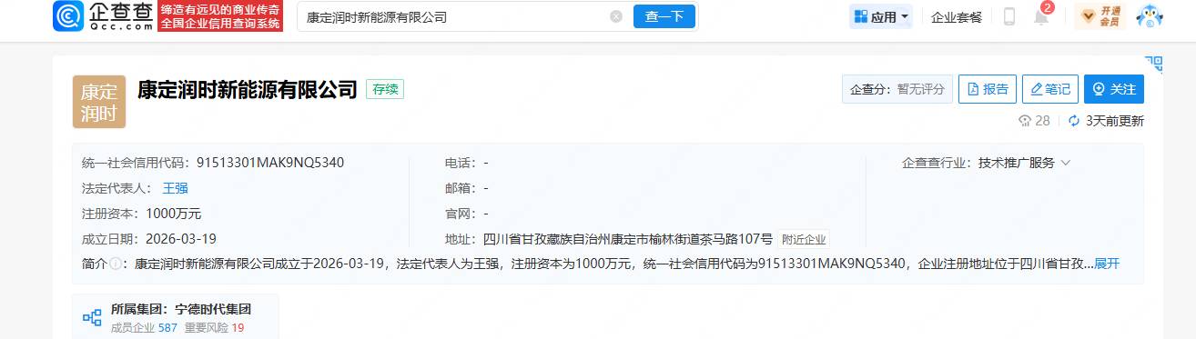 北极星储能网获悉,天眼查工商信息显示,3月19日,康定润时新能源有限公司成立,法定代表人为王强,注册资本1000万人民币,经营范围包括新兴能源技术研发、储能技术服务、风力发电技术服务、太阳能发电技术服务等。股东信息显示,该公司由宁德时代旗下...