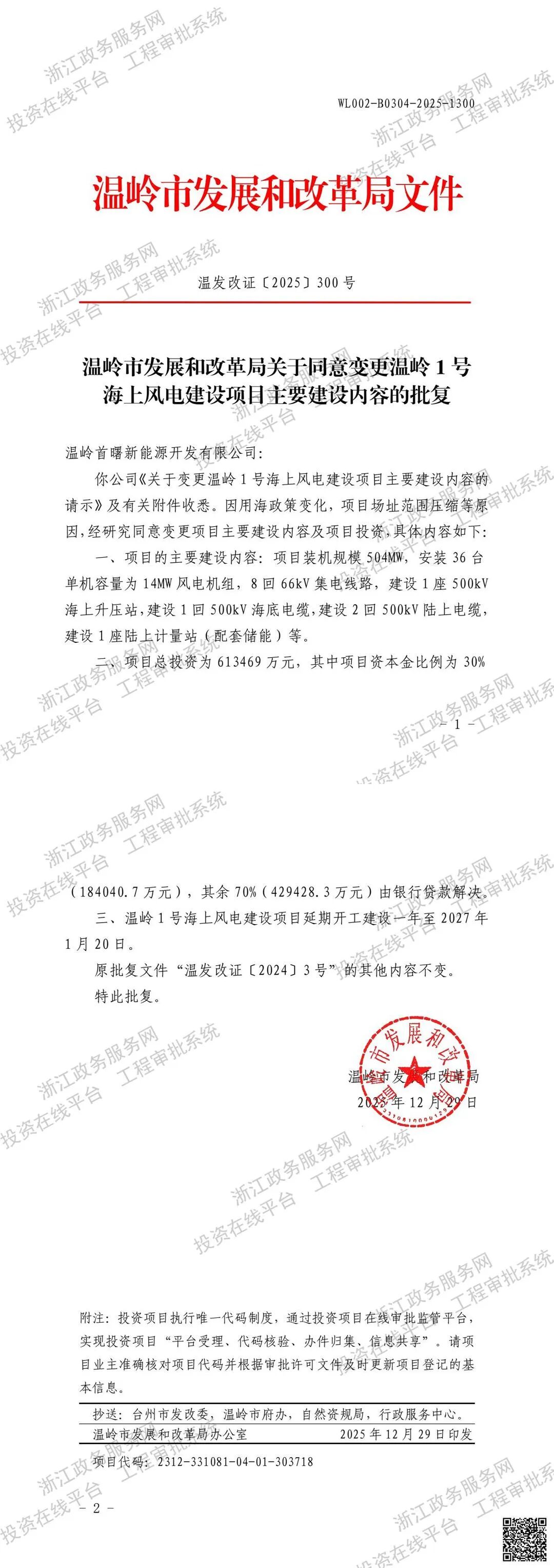 12月29日,温岭市发展和改革局发布《关于同意变更温岭1号海上风电建设项目主要建设内容的批复》、《关于同意变更温岭2号海上风电建设项目主要建设内容的批复》。根据批复,因用海政策变化,温岭1号、温岭2号项目场址范围压缩等原因,经研究同意变更两...