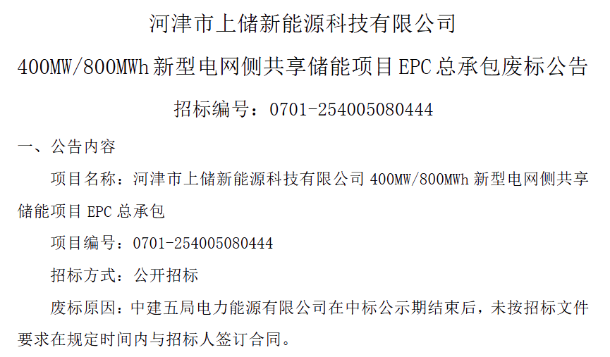 北极星储能网获悉,1月9日,河津市上储新能源科技有限公司发布山西400MW/800MWh电网侧共享储能EPC招标废标公告,原因是:中建五局电力能源有限公司在中标公示期结束后,未按招标文件要求在规定时间内与招标人签订合同。据悉,该项目招标人河...