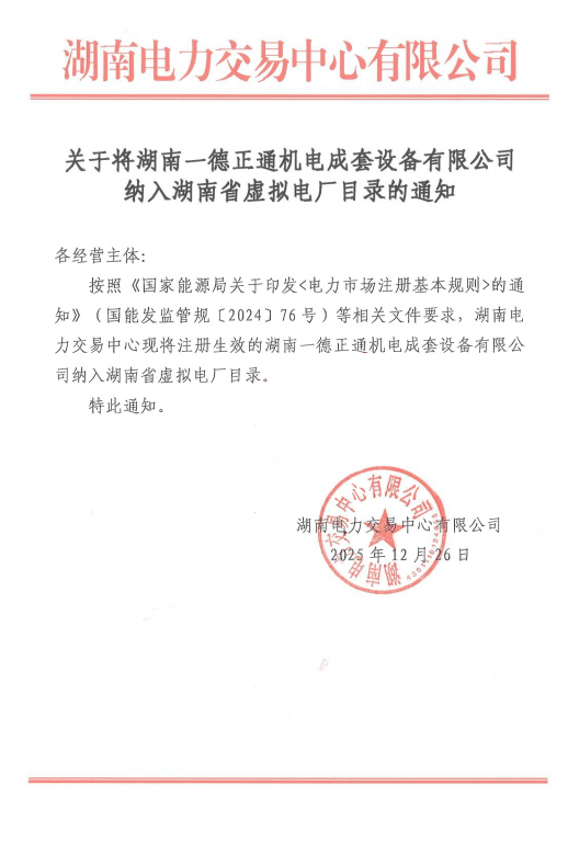 北极星电力市场网获悉,12月26日,湖南电力交易中心发布关于将湖南一德正通机电成套设备有限公司纳入湖南省虚拟电厂目录的通知。详情如下:...