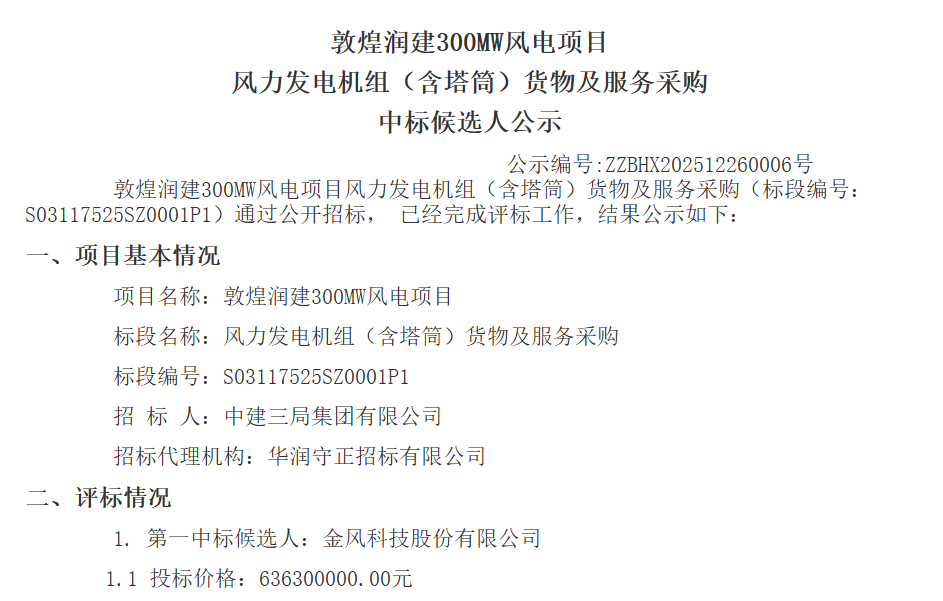 北极星风力发电网获悉,12月26日,华润电力发布《敦煌润建300MW风电项目风力发电机组(含塔筒)货物及服务采购中标候选人公示》。《公示》显示,该项目中标候选人第一名为金风科技,投标报价63630万元。根据招标公告,该项目位于甘肃省酒泉市敦...