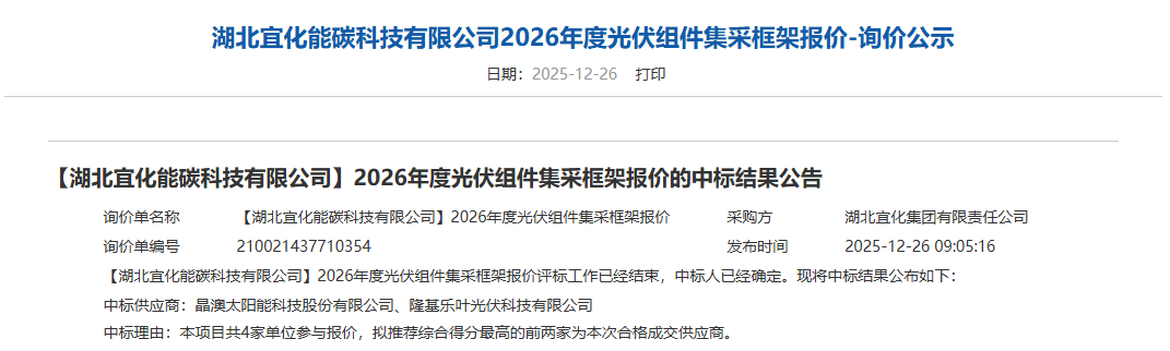 12月26日,湖北宜化能碳科技有限公司2026年度光伏组件集采框架报价的中标结果发布,中标供应商为晶澳太阳能科技股份有限公司、隆基乐叶光伏科技有限公司。...