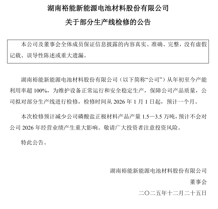 北极星储能网获悉,12月25日晚,湖南裕能、万润新能同时发布公告,拟对部分产线减产检修,两家受影响产能合计将达2~5.5万吨。其中湖南裕能受影响的产线,检修时间自2026年1月1日起,预计一个月,预计减少磷酸盐正极材料产品产量1.5—3.5...