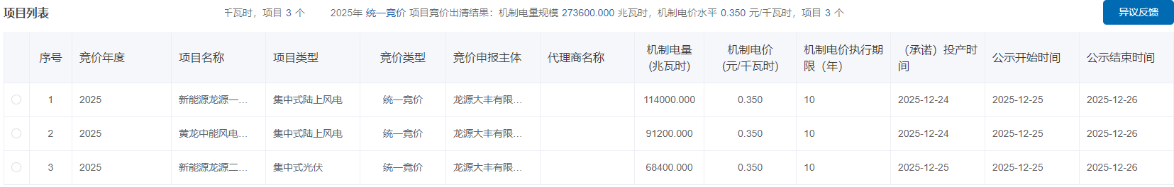 北极星电力市场网获悉,12月25日,西藏2025年度新能源机制电价竞价结果公示,2025年统一竞价项目竞价出清结果:机制电量规模273600兆瓦时,机制电价水平0.35元/千瓦时,项目3个,其中包括2个集中式陆上风电项目、1个集中式光伏项目...