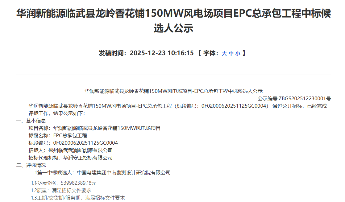 近日,华润新能源临武县龙岭香花铺150MW风电场项目EPC总承包工程中标候选人公示,第一中标候选人:中国电建集团中南勘测设计研究院有限公司,投标价格:539982389.18元,折合单价约3.5999元/W。招标内容和范围: 本工程建设期容...