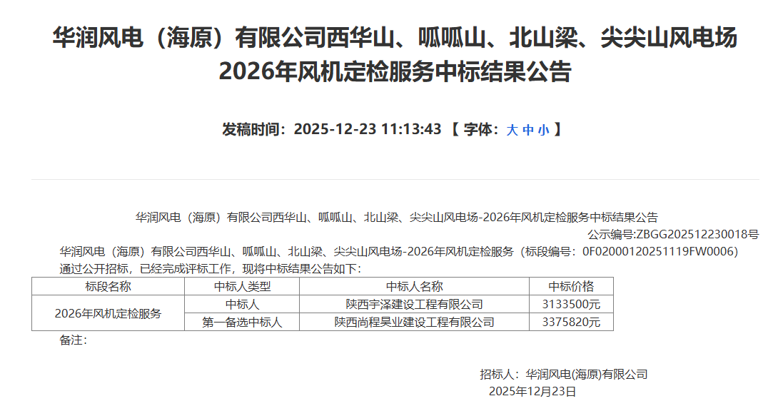北极星风力发电网获悉,近日,华润风电(海原)有限公司西华山、呱呱山、北山梁、尖尖山风电场2026年风机定检服务中标结果公布,详情如下:招标内容和范围: 1、西华山风电场106台中车WT2000/D110H80型风机全年、半年检修,44台运达...