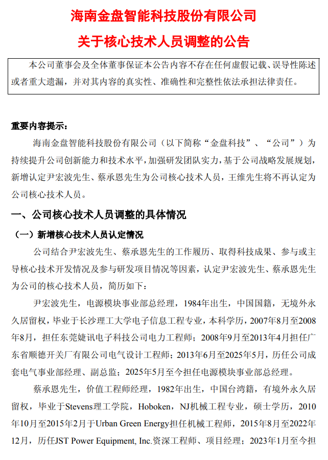 北极星风力发电网获悉,3月21日,海南金盘智能科技股份有限公司发布公告,宣布对公司核心技术人员团队进行重要调整。公告显示,为持续提升公司创新能力和技术水平,加强研发团队实力,公司新增认定尹宏波先生与蔡承恩先生为核心技术人员,而王维先生将不再...