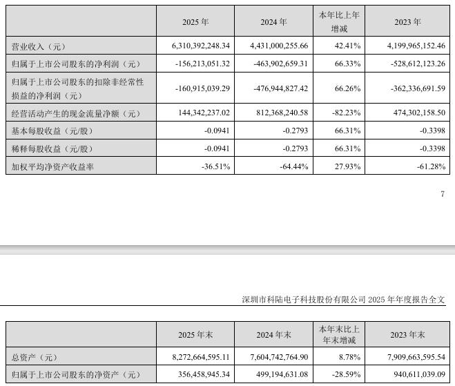3月20日晚,深圳市科陆电子科技股份有限公司发布2025年度报告。2025年,科陆电子营业收入达63.10亿元,同比增长42.41%;净利润亏损1.56亿元,较上年亏损同比减亏66.33%,盈利状况改善。营收结构方面,储能业务为绝对主力,全...