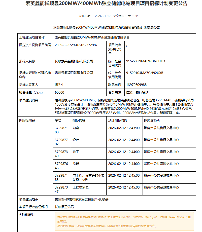 北极星储能网获悉,1月12日,长顺索英鑫能科技有限公司发布200MW/400MWh独立储能电站项目招标计划,投资估算60000万元,约合1.5元/Wh。资金来源自筹、银行贷款,项目建设地点贵州省黔南布依族苗族自治州长顺县。建设规模为200M...