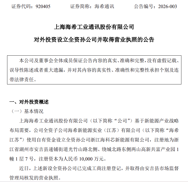 北极星储能网获悉,1月9日,海希通讯发布公告,对外投资1亿元设立全资孙公司并取得营业执照。海希通讯表示,基于新能源产业战略布局需要,由全资子公司海希新能源实业(江苏)有限公司使用自有资金,设立全资孙公司浙江海科芯新能源有限公司,注册地为浙江...