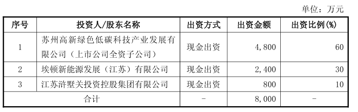 北极星储能网获悉,1月10日,苏州新区高新技术产业股份有限公司披露设立苏州高新埃顿新能源发展有限公司的对外投资公告,公告提及,合资公司注册资本8000万元,苏州高新全资子公司苏州高新绿色低碳科技产业发展有限公司(以下简称“绿碳公司”)出资4...