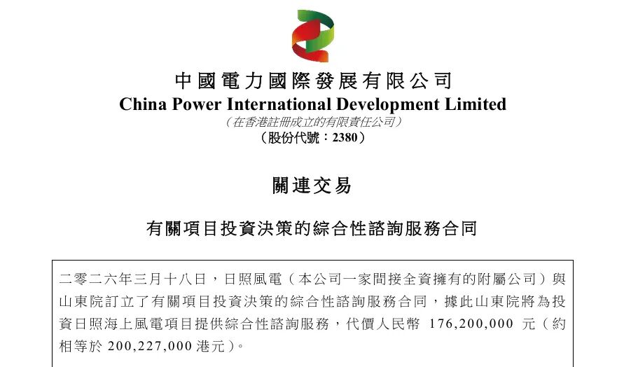 3月18日,中国电力国际发展有限公司(以下简称“中国电力”或“公司”)发布《有关项目投资决策的综合性咨询服务合同》。公告披露,2026年3月18日,中国电力间接全资拥有的附属公司国电投(日照)海上风电有限公司(以下简称“日照风电”)与山东电...