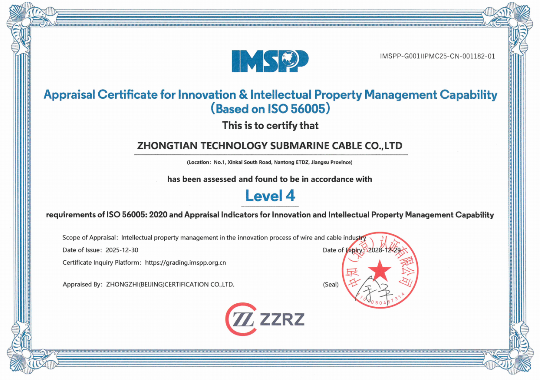 近日,中天科技海缆股份有限公司(以下简称“中天海缆”)通过创新与知识产权管理能力分级评价,成为全国线缆行业首家荣获ISO56005《创新与知识产权管理能力》4级证书的企业,标志着公司在创新与知识产权管理的系统化、国际化水平上取得关键突破。I...