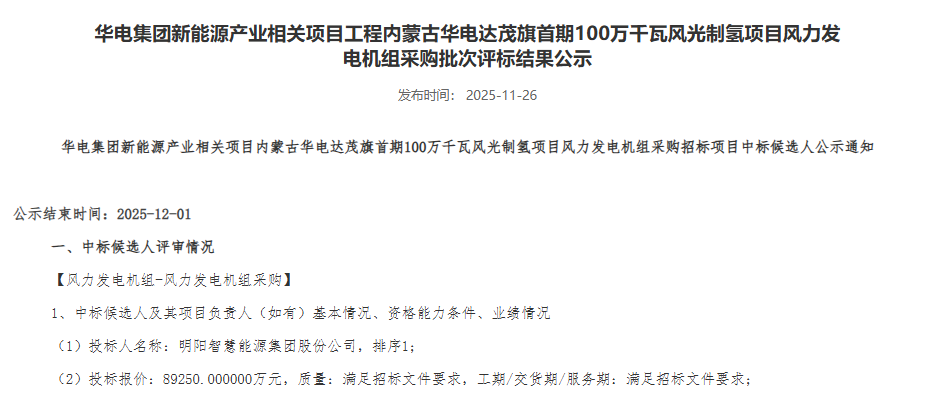 北极星风力发电网获悉,11月26日,华电集团发布《华电集团新能源产业相关项目工程内蒙古华电达茂旗首期100万千瓦风光制氢项目风力发电机组采购批次评标结果公示》。《公示》显示,该项目中标候选人第一名为明阳智能,投标报价89250万元。根据招标...