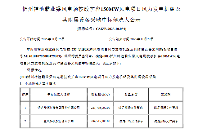 北极星风力发电网获悉,11月26日,忻州神池霸业梁风电场技改扩容150MW风电项目风力发电机组及其附属设备采购中标候选人公示,运达股份预中标,投标报价28173.6万元。项目概况和招标范围项目规模:本项目拟先拆除原有66台0.75MW风电机...