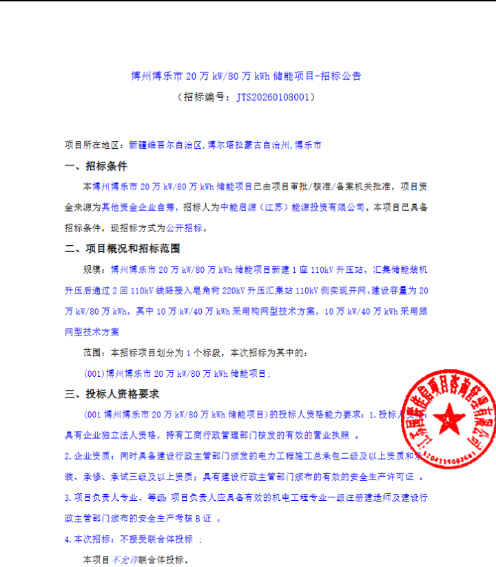 1月8日,中能启源(江苏)能源投资有限公司委托江苏国佳信项目咨询管理有限公司,发布博州博乐市20万kW/80万kWh(即200MW/800MWh)储能项目公开招标公告。该项目位于新疆维吾尔自治区博尔塔拉蒙古自治州博乐市,资金来源为其他资金企...
