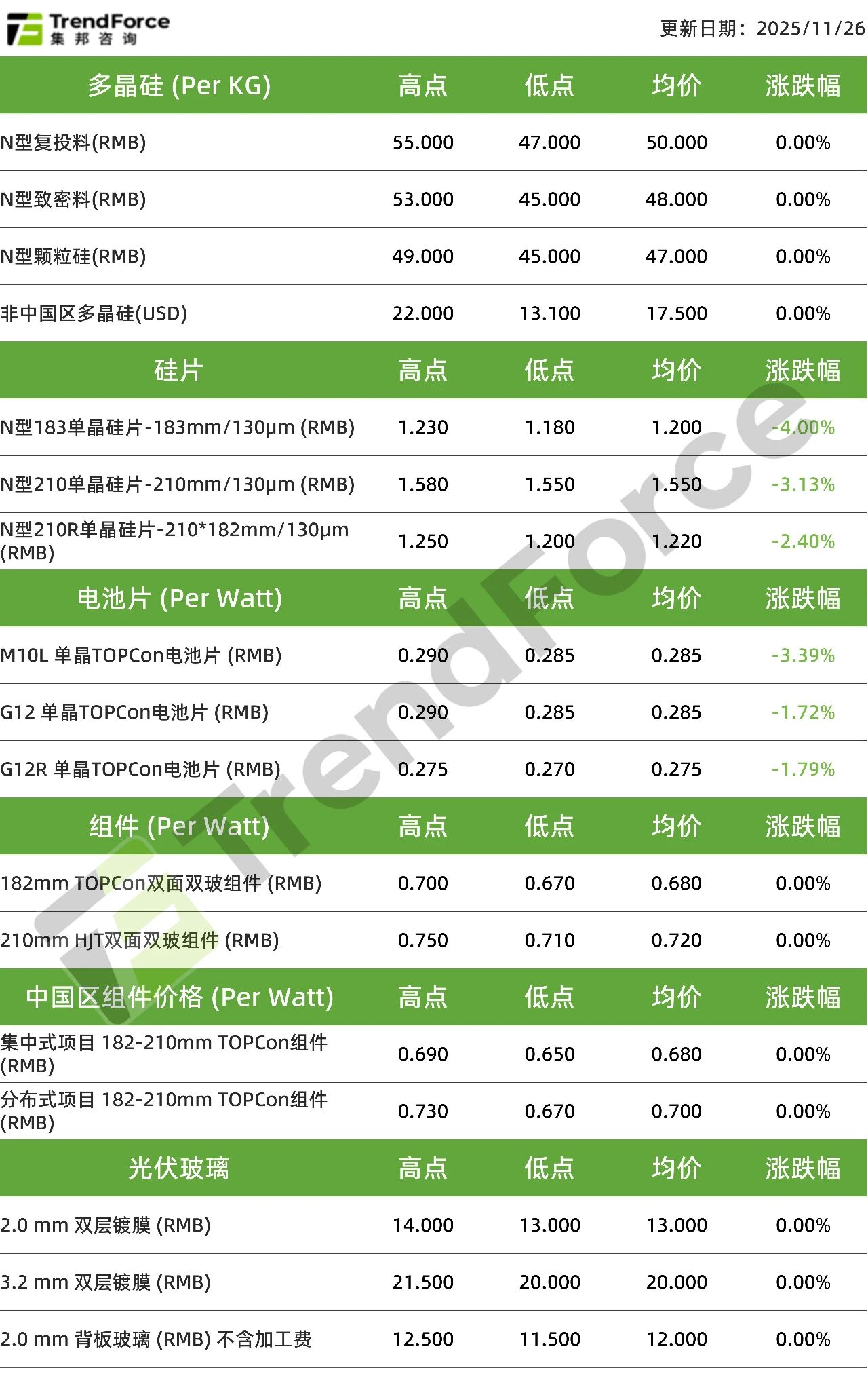 根据TrendForce集邦咨询旗下新能源研究中心《全球光伏产业链价格趋势月报》最新调研数据,多晶硅、光伏组件和玻璃各环节价格与上周持平,硅片、电池片环节出现价格波动。根据11月26日最新报价,N型复投料主流成交价格为50元/KG;N型致密...