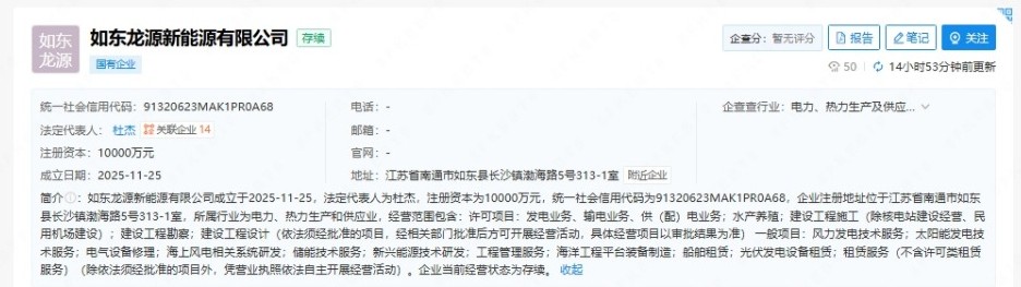 2025年11月25日,如东龙源新能源有限公司成立,该公司注册地位于江苏省南通市如东县,法定代表人为杜杰,注册资本为10000万元。在业务经营范围上,如东龙源新能源有限公司主要涉足电力、热力生产和供应业领域,具体涵盖发电业务、输电业务、供(...